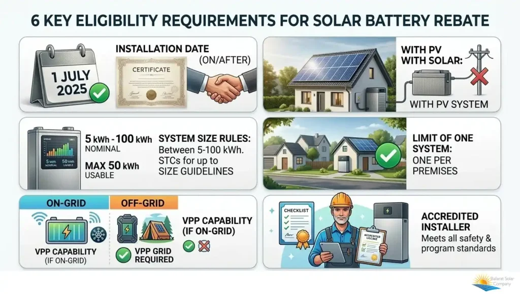 • The battery must be installed on or after 1 July 2025, based on the electrical compliance certificate date.